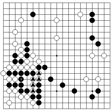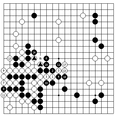 图2(实战的进行) 实战中,白1跨虽然是常型,,但是黑2、4以后,黑6是一举双得的好手,即可以防止黑3子被吃,又可以封锁住左边白棋。到白11是白后手双活,黑得以在中央先动手,黑18以后,黑a叫吃可以吃住白三角形两子,中央的黑反而成为厚势,黑明显优势。与图1相比,黑白形势反转。 |