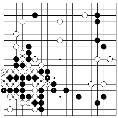 图1(愚型妙手) 白1是妙手。以下到黑6是双活。但是黑外面还有a的断点。显然白好。 |