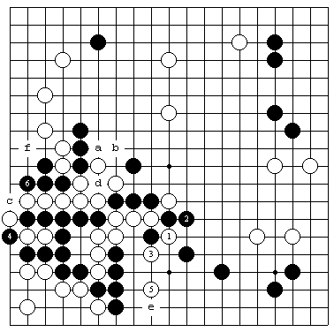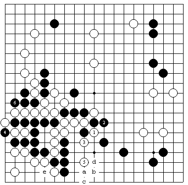 图3(白没有把握的对攻) 如图是实战过程的前半段,此时白1如果在这里叫吃,黑2长,白3吃一子,黑4求活,黑5夹,左边黑棋先手求活,然后黑a托、白b、黑c、白d、黑e,黑已经活出,此结果白不能考虑。 |