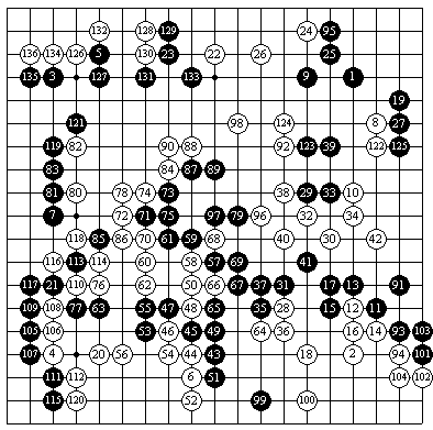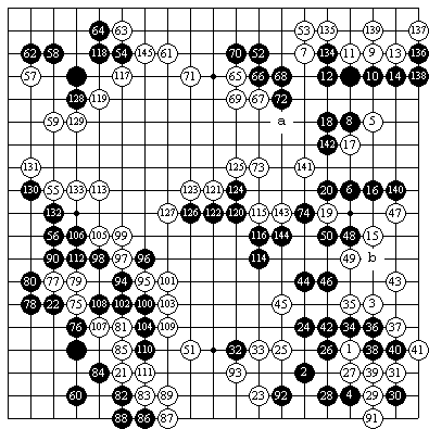 黑 克里木(被让3子) 白 季荣强 5P 黑20应该脱先。 24应该在39小尖,到50,黑局部亏损。 62应该在71攻击。 72应该走a位。 74应该走b位是好手。 98本局败着,吃掉中央三子被白围起中央的空,黑已呈败势,应该在99打吃。这样黑仍然优势 (季荣强 5P点评) |